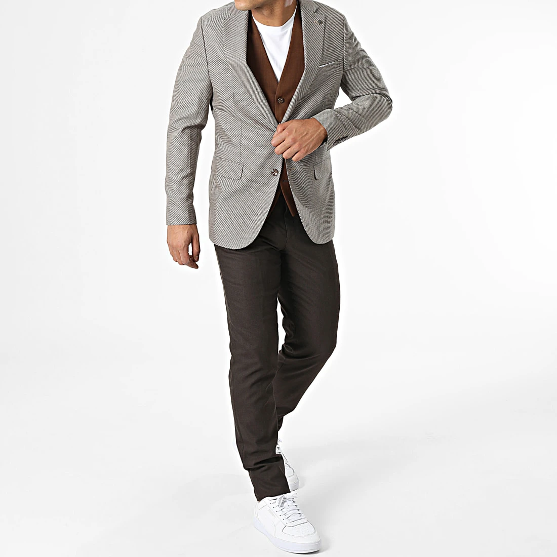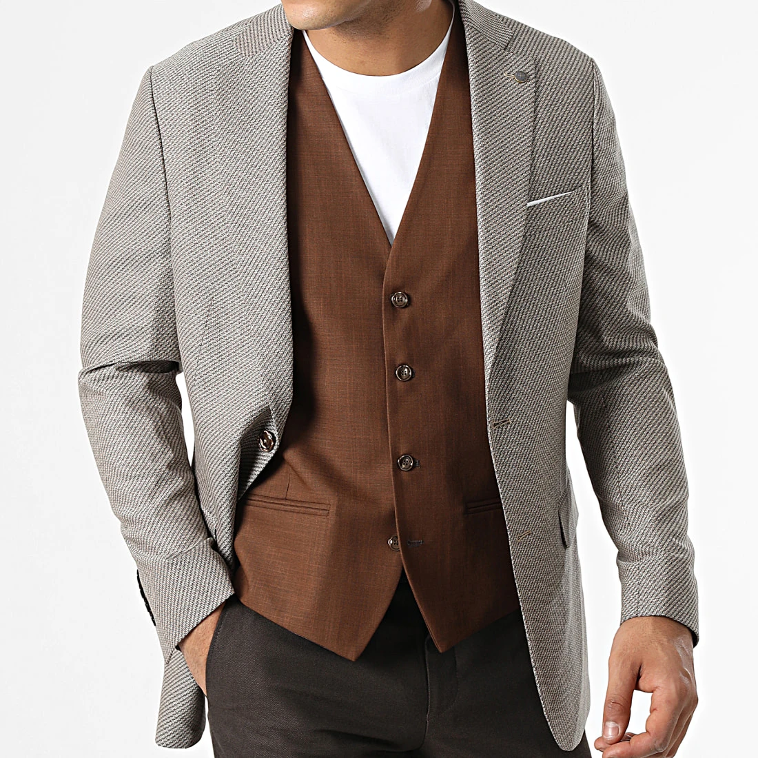• Ensemble de costume trois pièces composé d’une veste blazer, d’un gilet et d’un pantalon droit élégant