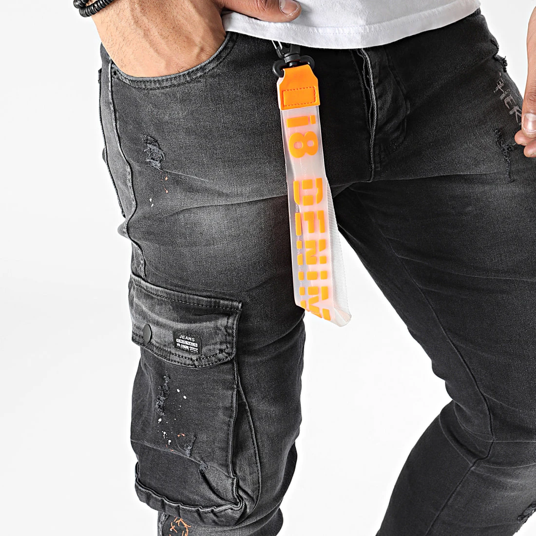 • Jean finition tachée, usée et délavée avec pendentif amovible suspendu