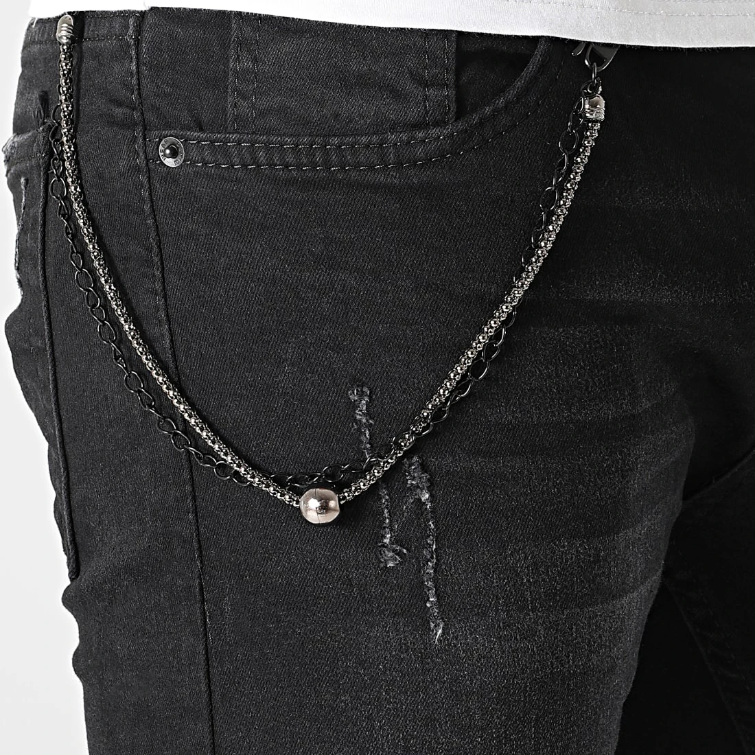 âąÂ Jean skinny finition usĂ©e et dĂ©lavĂ©e avec chaines mĂ©talliques amovibles