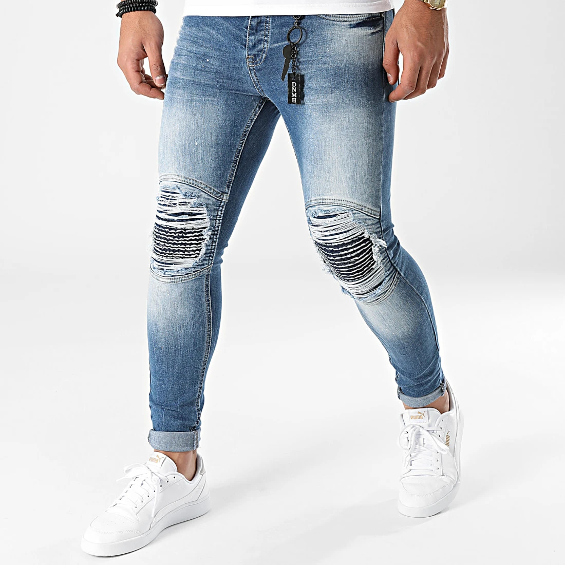 • Jean finition usée, tachée et délavée avec rapiéçages et pendentif amovible suspendu