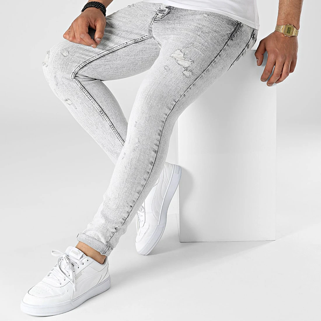 • Jean skinny finition délavée, tachée et usée avec rapiéçages