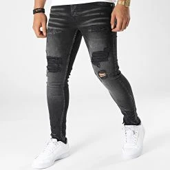 • Jean tendance finition tachée, usée et délavée avec rapiéçages