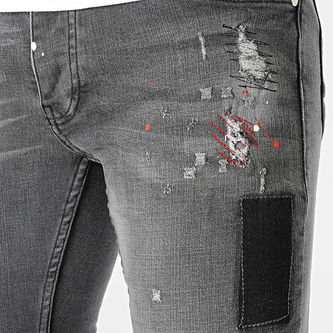• Finition usée, délavée et tachée avec rapiéçages