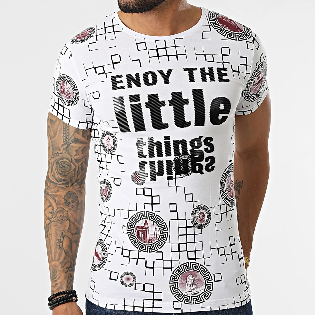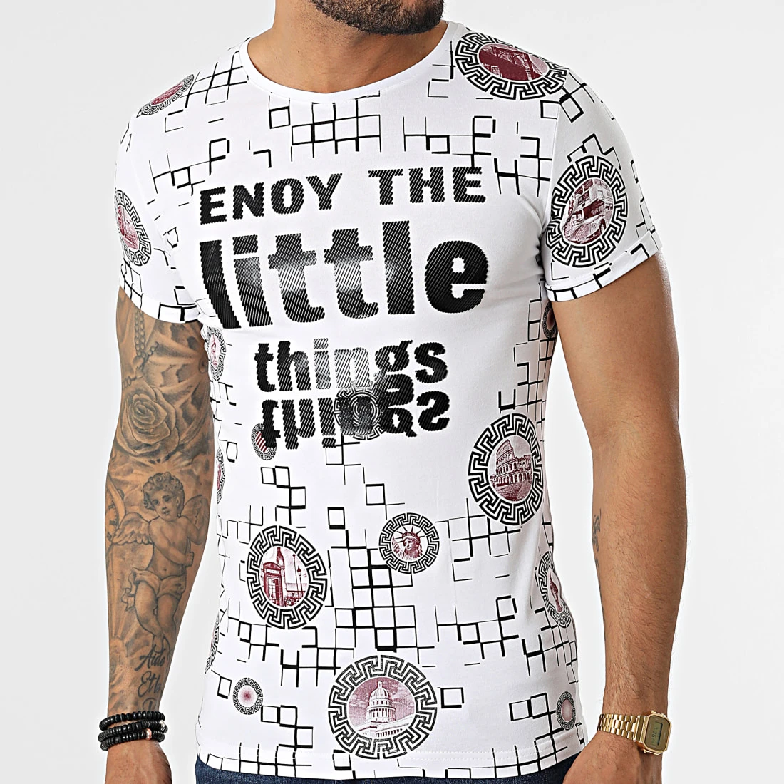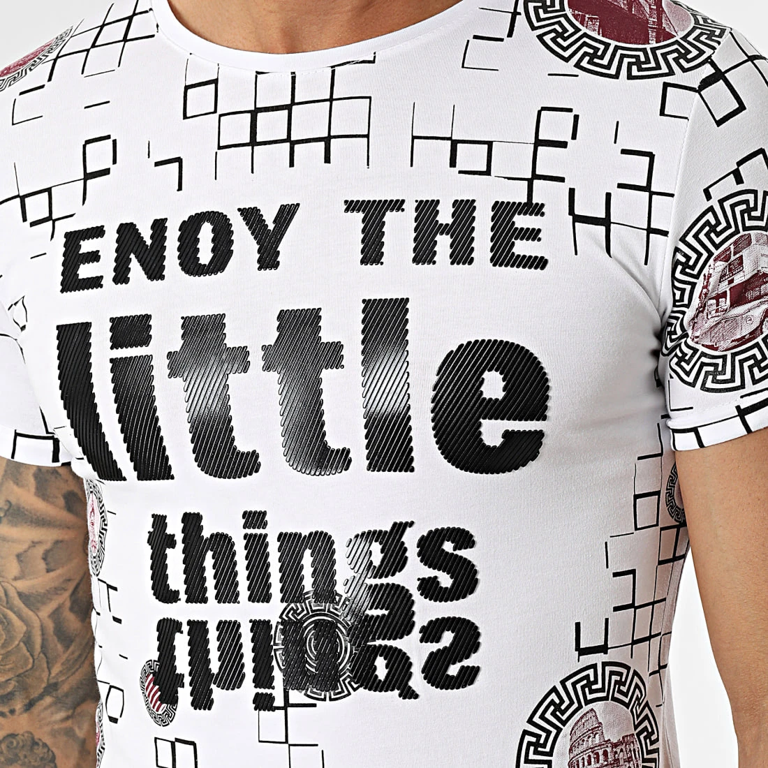 • Tee shirt en coton stretch imprimé et appliqué visuel en relief